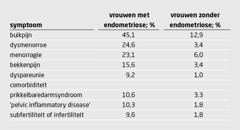 In de onderstaande tabel staan de meest voorkomende symptomen en diagnoses bij patiënten die uiteindelijk de diagnose 'endometriose' kregen; deze gegevens werden geregistreerd tijdens huisartsbezoeken in de drie jaar voorafgaand aan de diagnose. Hoe meer symptomen, des te groter de kans op endometriose. Vrouwen die uiteindelijk de diagnose 'endometriose' kregen, waren vaker bij een dokter geweest en hadden een twee keer zo hoog risico op werkverzuim als vrouwen zonder endometriose.
